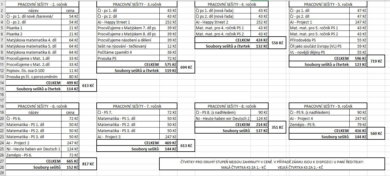 Stejně jako loni si můžete sešity zakoupit přímo ve škole a to u třídních učitelů nebo u paní ředitelky. Ceny najdete po rozkliknutí obrázku.